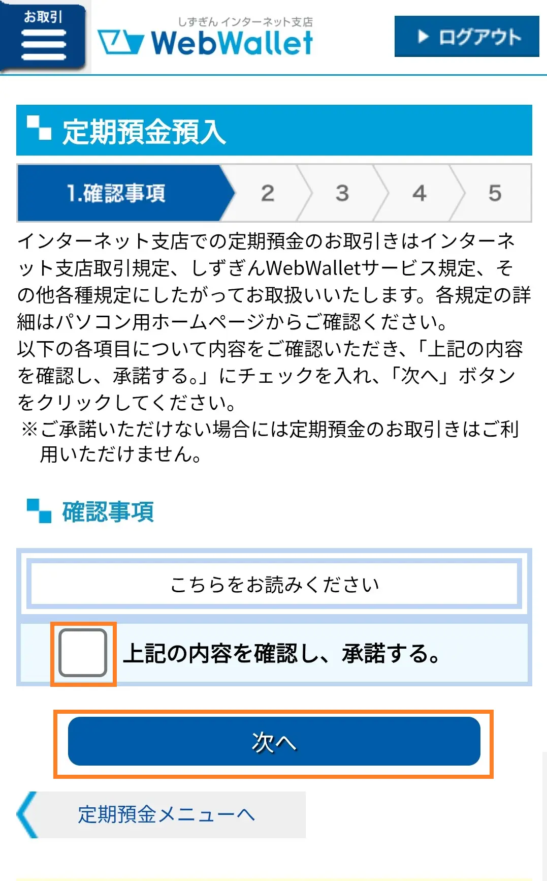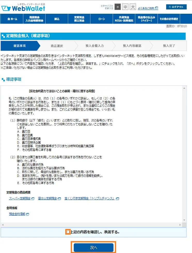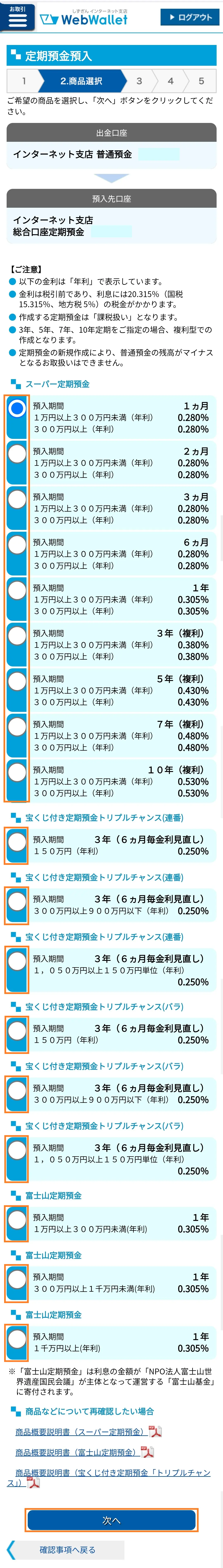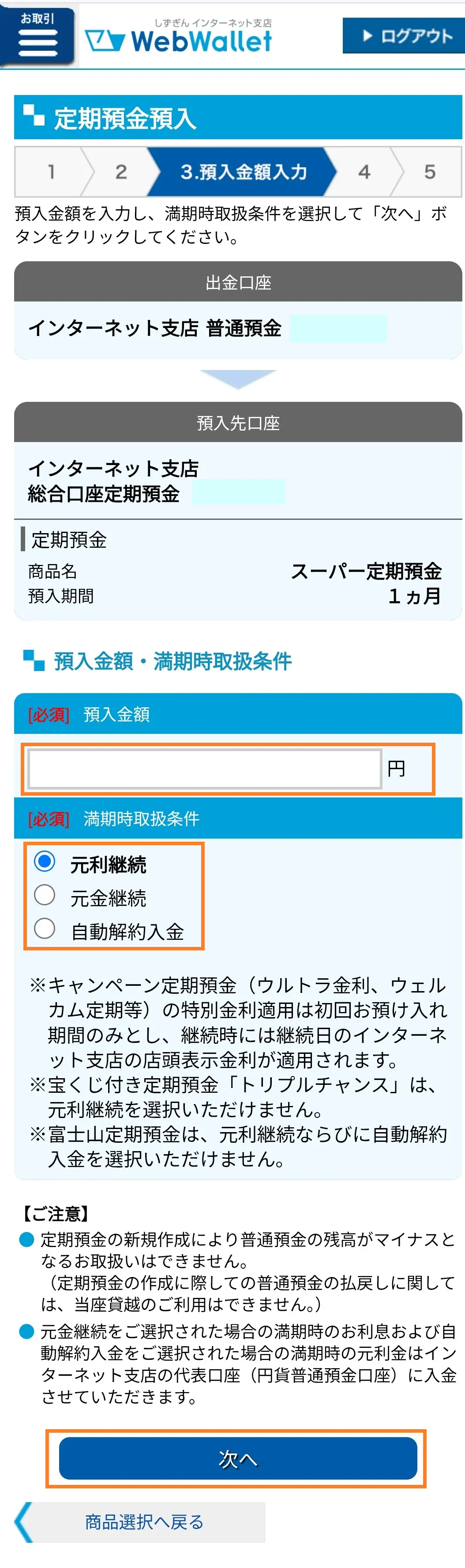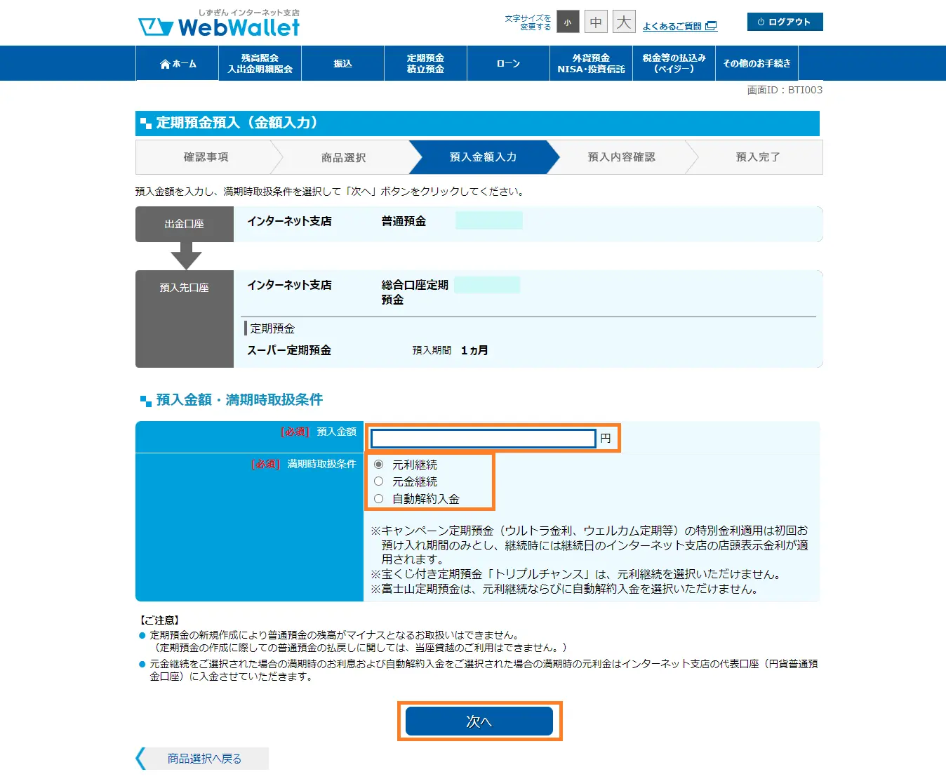 お預け入れいただく金額を入力し、満期時のお取り扱いを選択したうえで、[次へ]ボタンをクリックしてください。