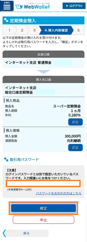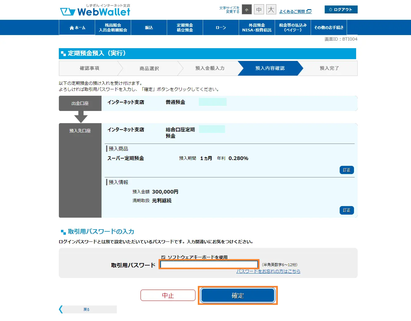 お取り引き内容を確認のうえ、取引用パスワードを入力し[確定]ボタンをクリックしてください。