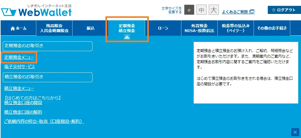 画面上部のサービスメニュー「定期預金・積立預金」をクリックすると、お取り引きボタンが表示されます。「定期預金メニュー」をクリックしてください。