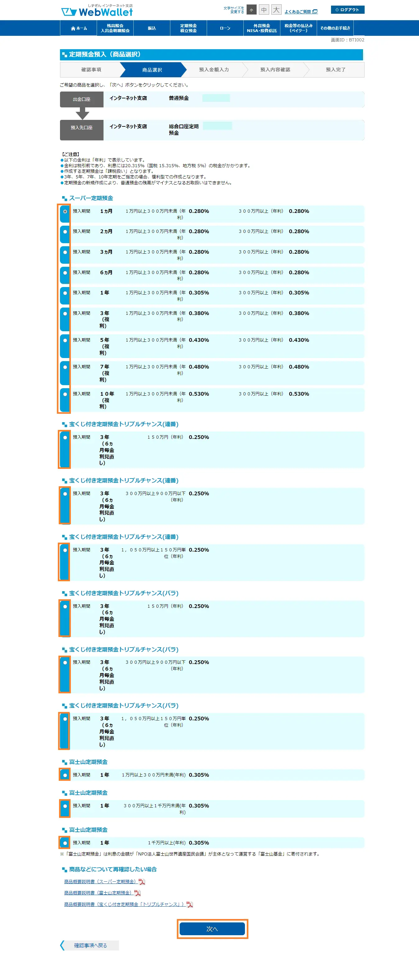 - ※「宝くじ付き定期預金『トリプルチャンス』」に預け入れる場合は、宝くじの種類(連番・バラ)、預入金額をご確認いただき商品を選択してください。